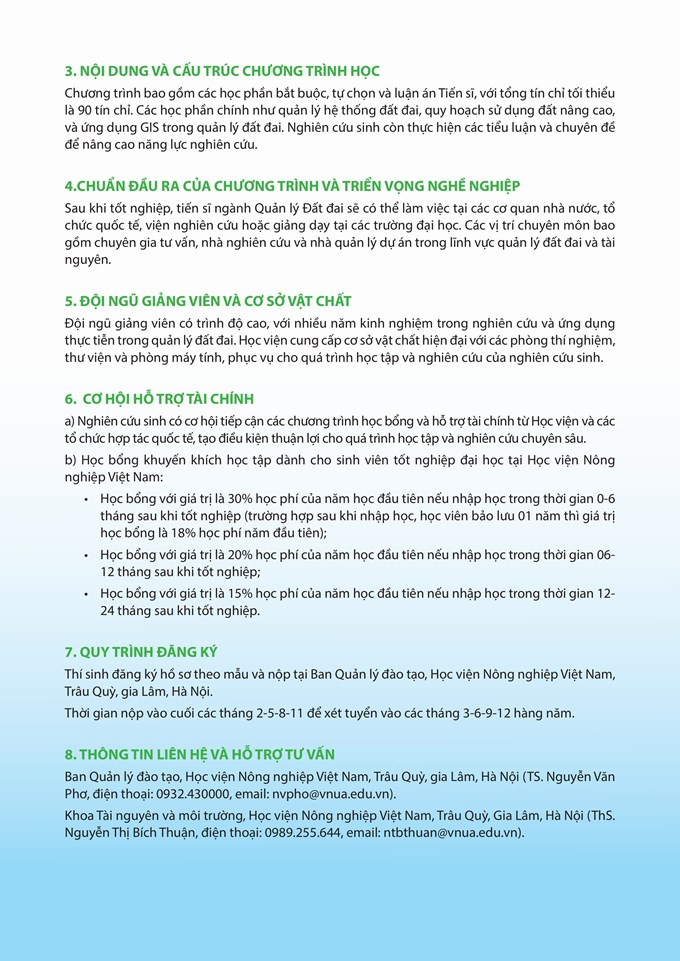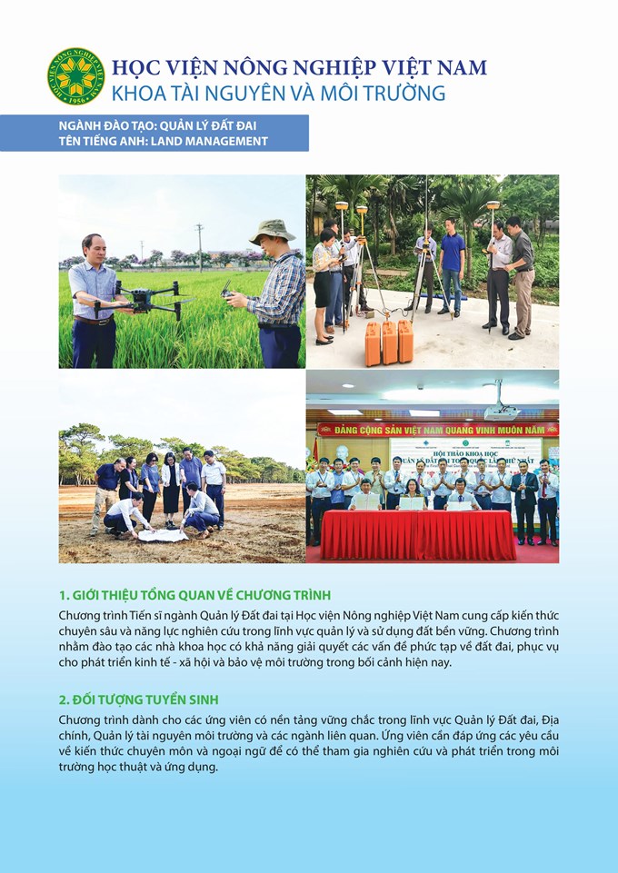 Chương trình tiến sĩ ngành Quản lý Đất đai tại Học viện Nông nghiệp Việt Nam nhằm đào tạo các nhà khoa học có khả năng giải quyết các vấn đề phức tạp về đất đai, phục vụ cho phát triển kinh tế- xã hội và bảo vệ môi trường trong bối cảnh hiện nay