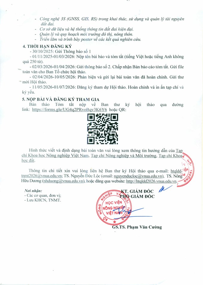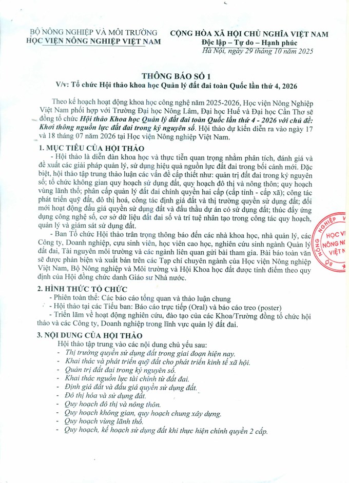 Thông báo số 1 về việc tổ chức Hội thảo khoa học Quản lý đất đai toàn Quốc lần thứ 4, 2026