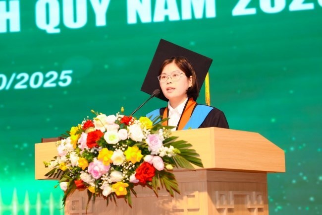 | Học viên Trần Thị Thanh Ngân, ngành Khoahọc cây trồng đại diện cho 1.463tân thạc sĩ,tân kỹ sư, tân cử nhân, tân bác sĩ thú y phát biểu cảm tưởng tại buổi Lễ và tặng hoa tri ân thầy, cô |
