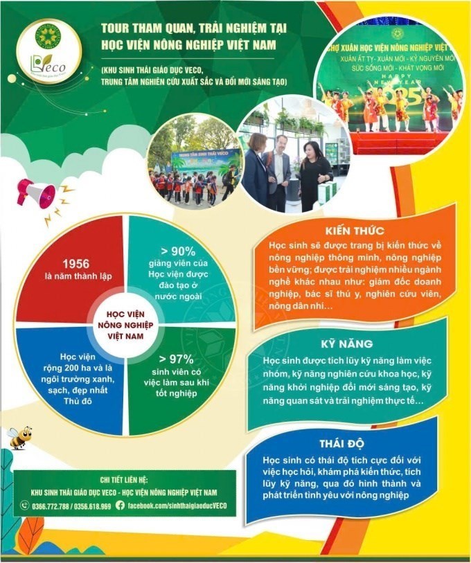 Bên cạnh vai trò là cơ sở đào tạo, nghiên cứu và chuyển giao tri thức hàng đầu trong lĩnh vực nông nghiệp, Học viện Nông nghiệp Việt Nam còn chú trọng xây dựng các không gian học tập gắn với thực tiễn. Tiêu biểu là Khu Sinh thái Giáo dục VECO, nơi tái hiện môi trường tự nhiên trong lành, đa dạng sinh học, tạo điều kiện để học sinh, sinh viên và cộng đồng trải nghiệm, khám phá và rèn luyện kỹ năng.