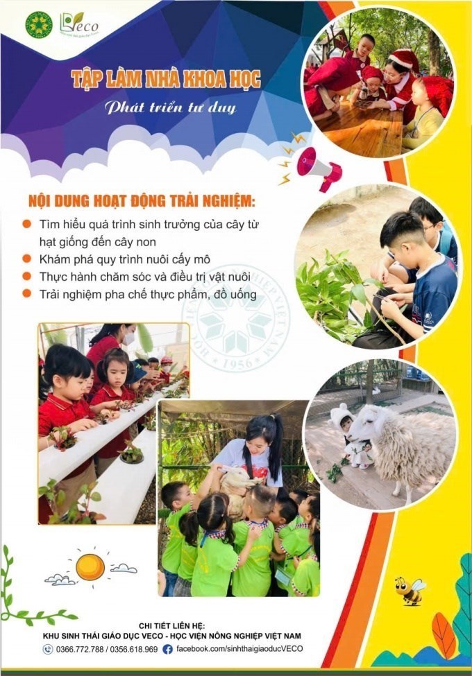 Các hoạt động giáo dục trải nghiệm tại Khu Sinh thái Giáo dục VECO – Học viện Nông nghiệp Việt Nam mở ra một hành trình khám phá nông nghiệp, khoa học và sáng tạo đầy hứng khởi dành cho học sinh. Thông qua chương trình, các em không chỉ được trang bị kiến thức nền tảng về nông nghiệp mà còn có cơ hội trải nghiệm thực tế, rèn luyện kỹ năng nghiên cứu khoa học, khởi nghiệp sáng tạo, đồng thời hình thành thái độ tích cực và tình yêu đối với thiên nhiên và nông nghiệp.