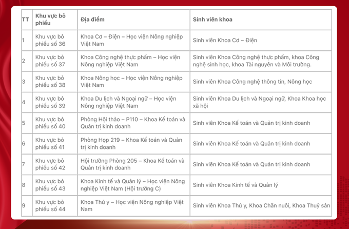 Theo tìm hiểu, căn cứ Kế hoạch số 04/KH-UBBC của Ủy ban bầu cử xã Gia Lâm thực hiện công tác bầu cử đại biểu Quốc hội khóa XVI và bầu cử đại biểu Hội đồng nhân dân các cấp, nhiệm kỳ 2026-2031, Học viện Nông nghiệp Việt Nam đã thành lập các tổ bầu cử với 09 khu vực bỏ phiếu.